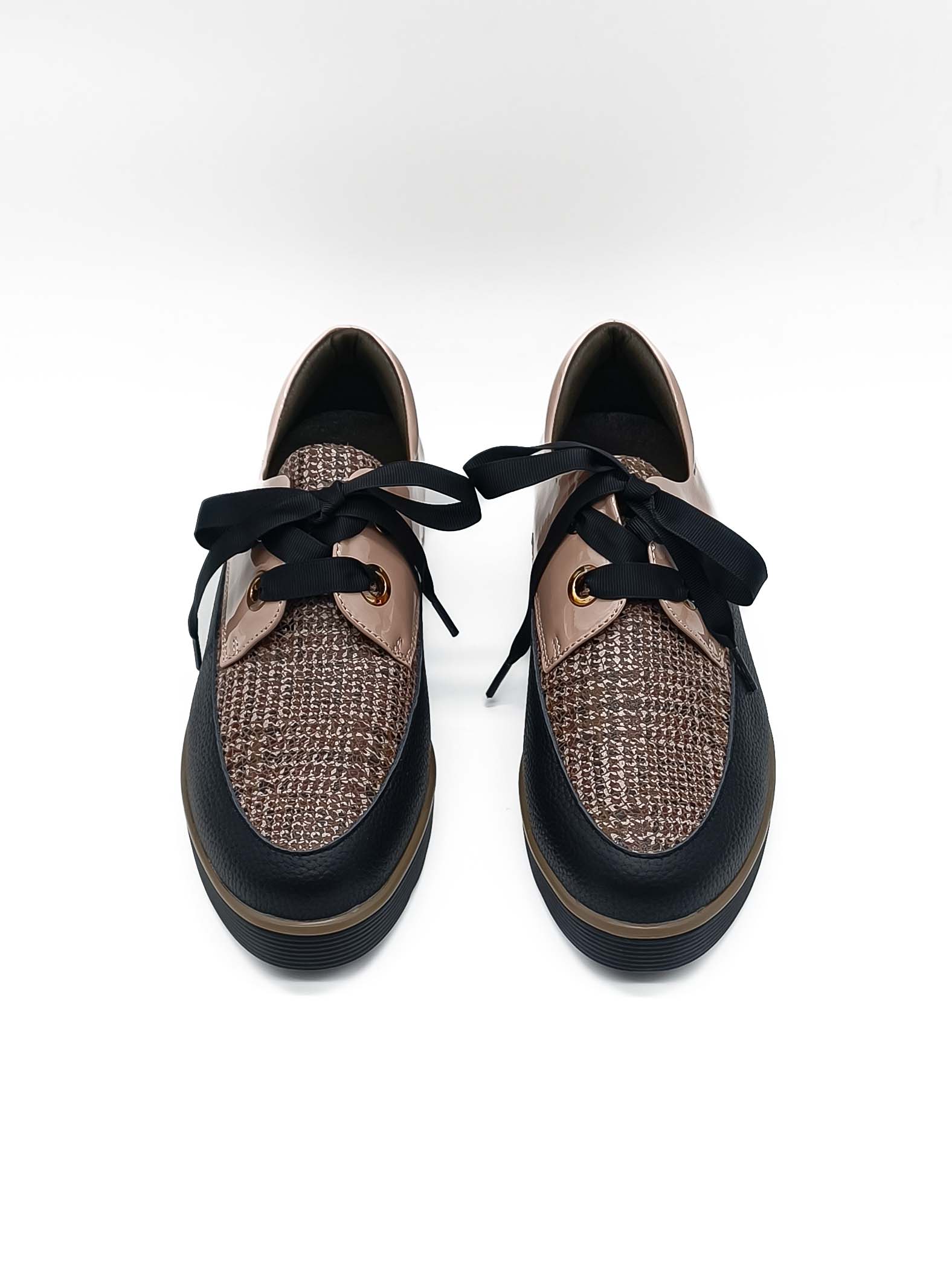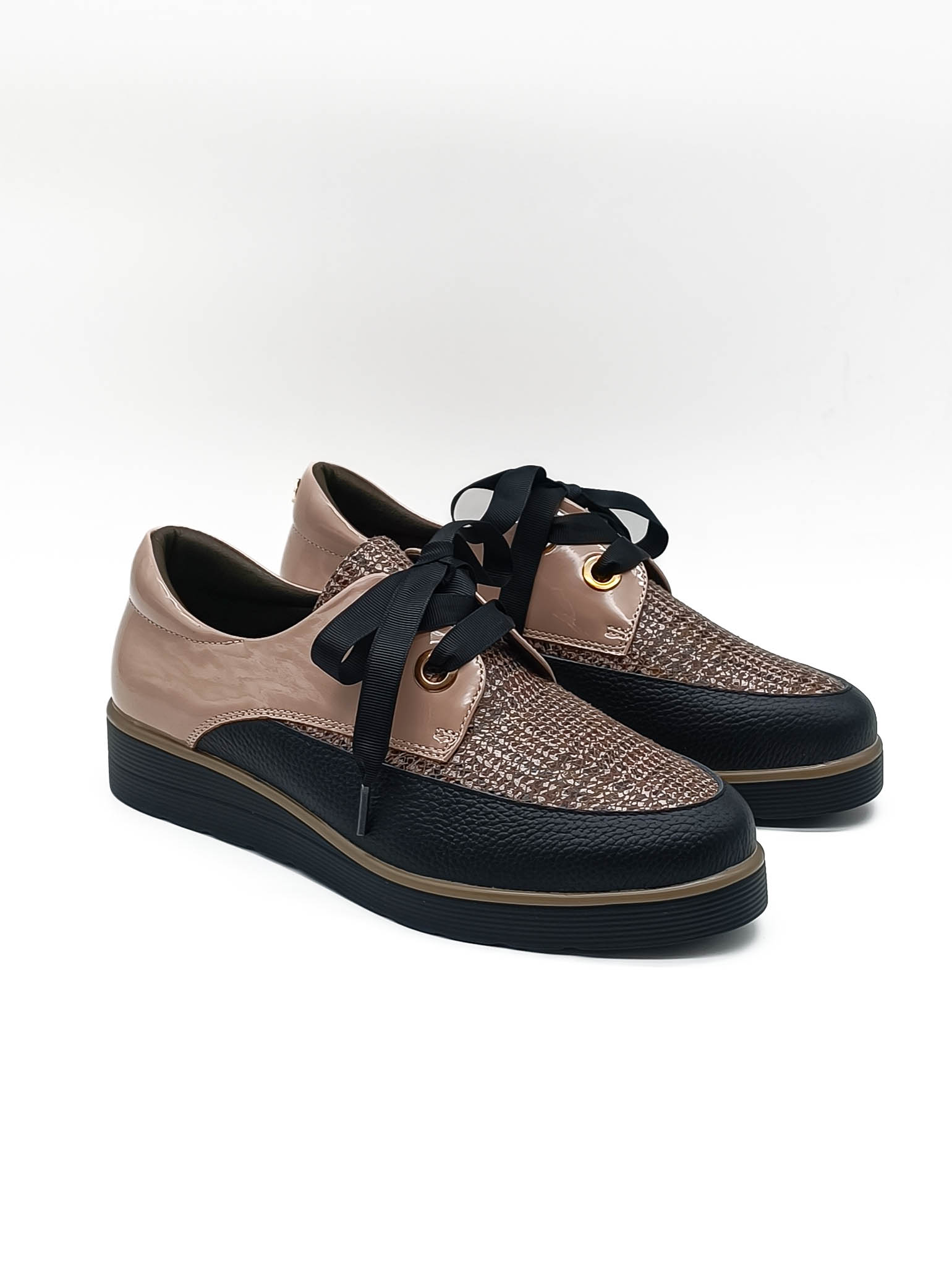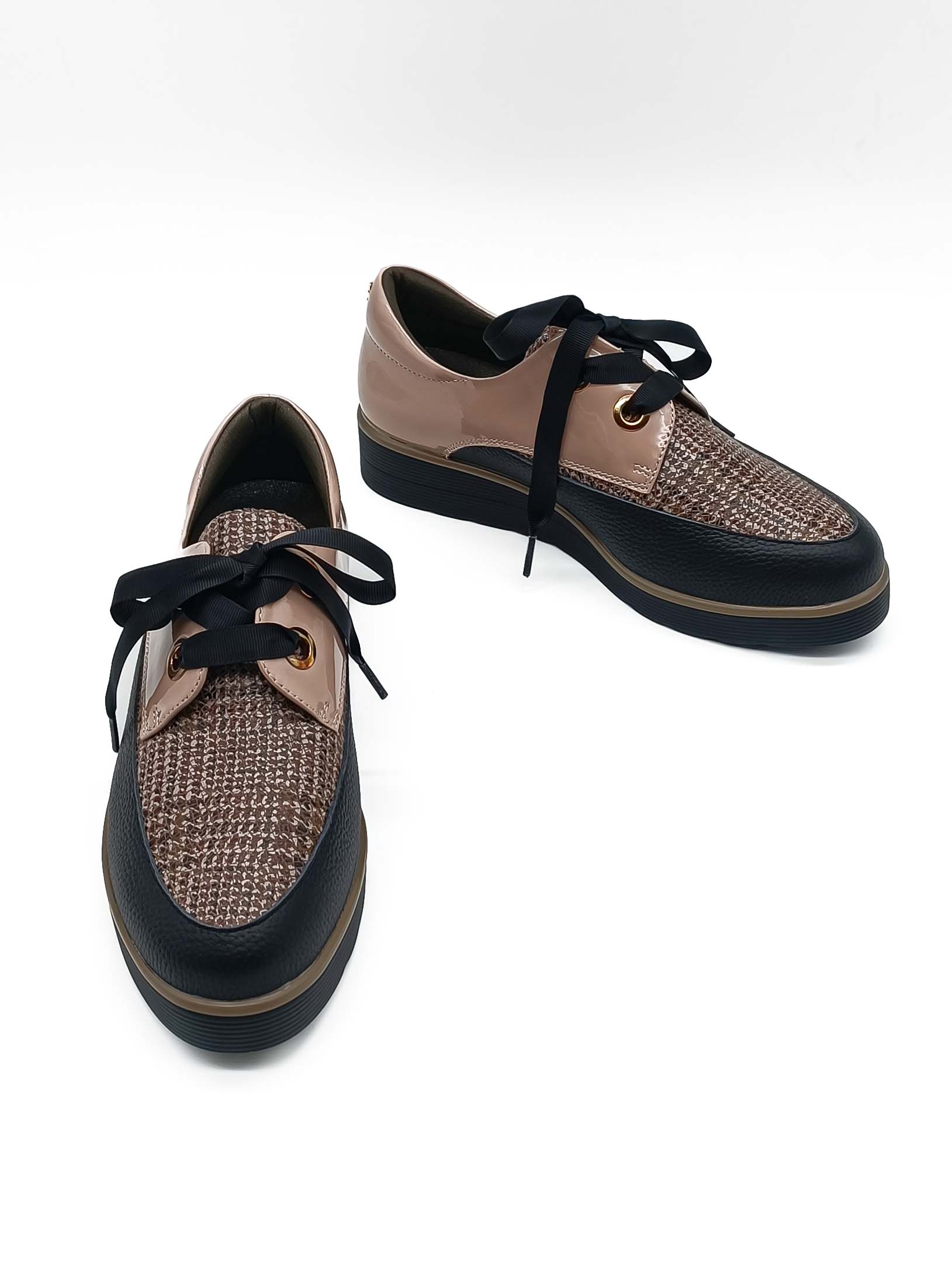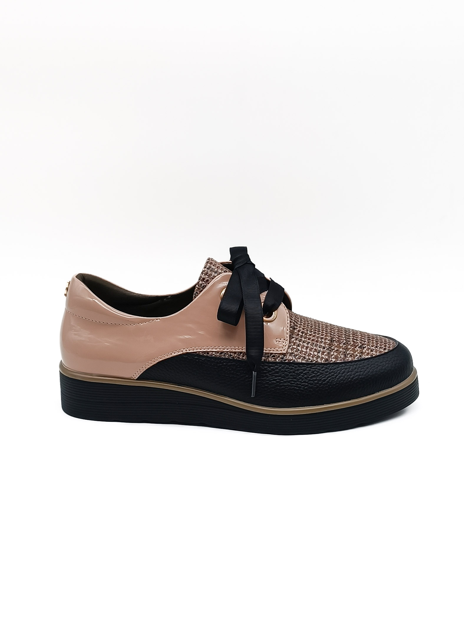 Preciosos zapatos tipo Oxford para mujer. Combinación espectacular de piel con dibujo de cuadros, piel charol y napa. Cordonera de lazo. Un estilo masculino con muchos toques de diseño y muy confortables.