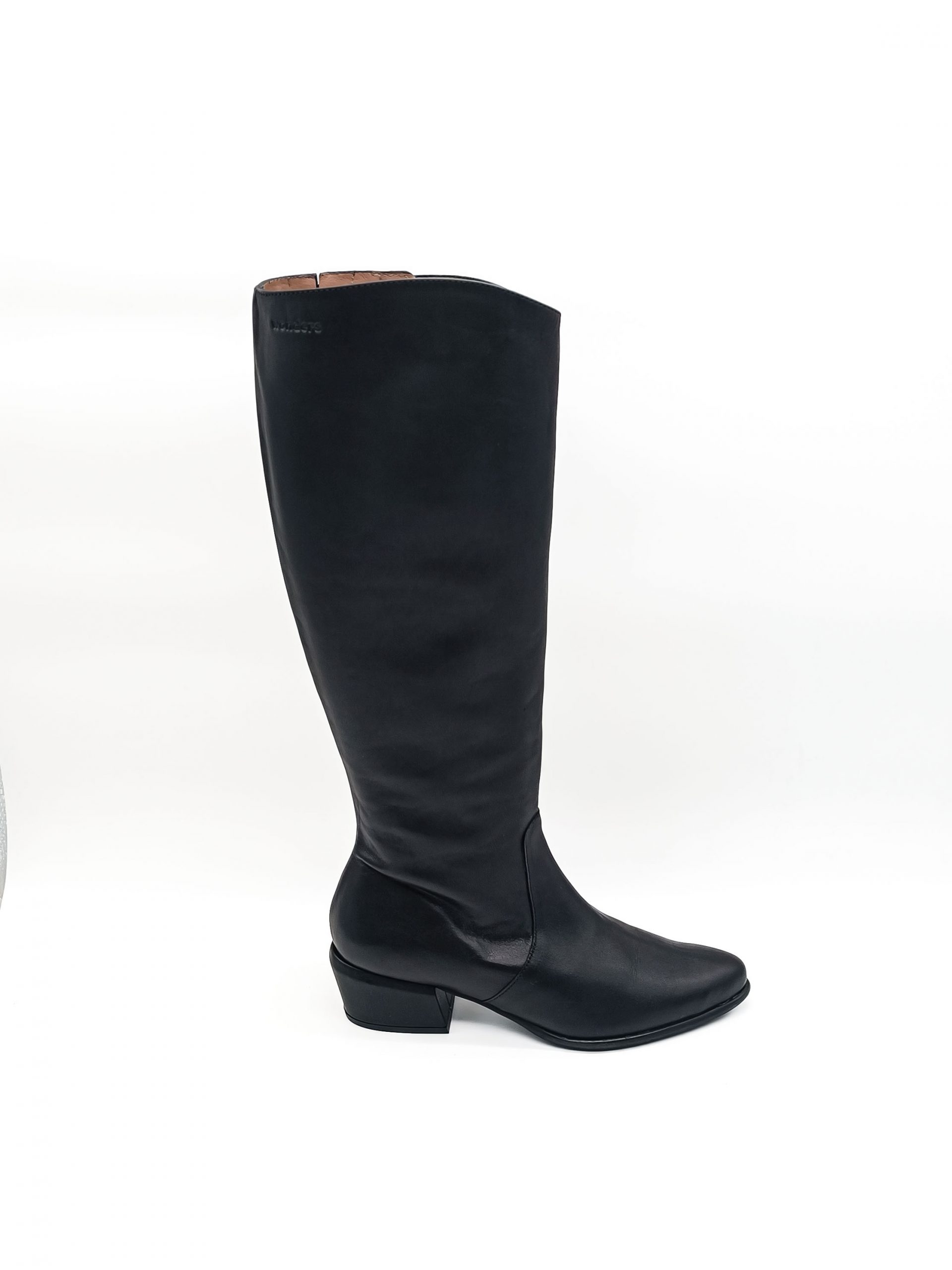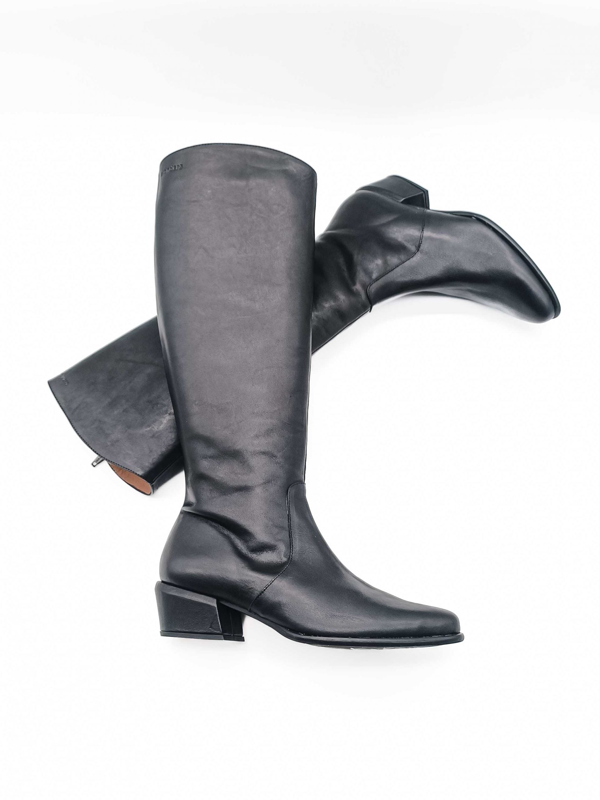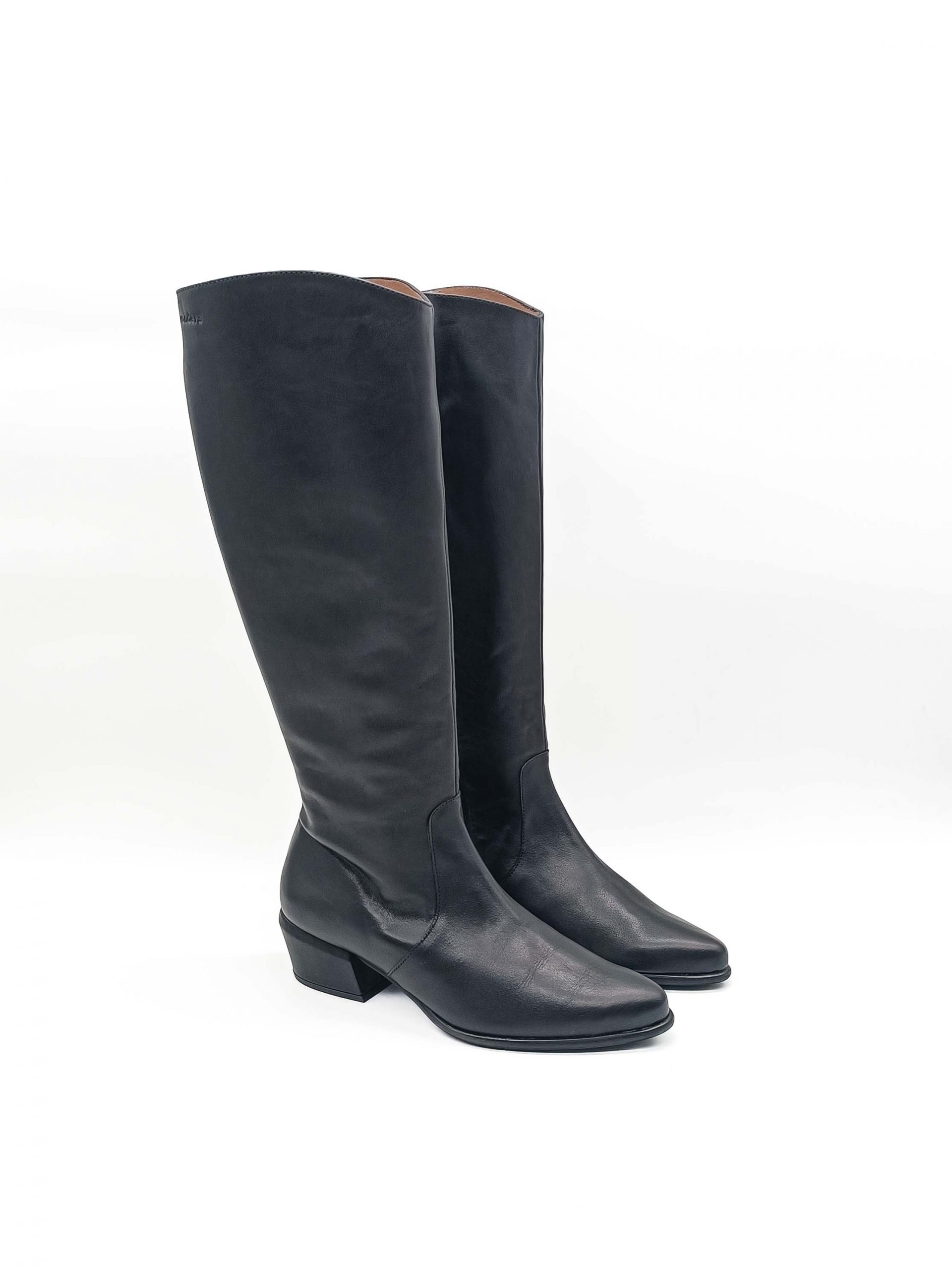 Botas altas de mujer en piel lisa negra. Este modelo de caña alta conquista por su elegancia sencilla. El diseño limpio se apoya en una puntera cuadrada y un tacón medio forrado en piel con forma trapezoidal, que ofrece estabilidad sin renunciar al estilo. Cremallera para facilitar el calce.