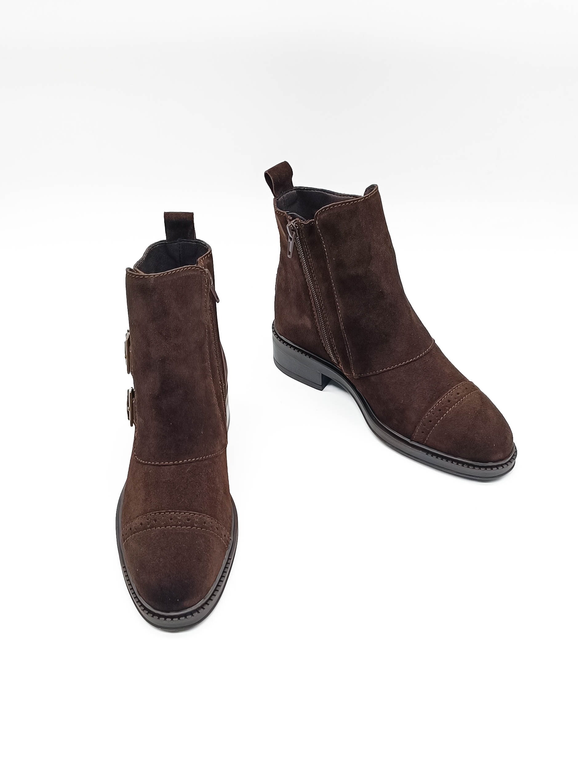 Botines de mujer en piel s de serraje. Con los detalles de las hebillas pero cierre en el costado interior con cremallera. Un estilo masculino ideal para darle esa impronta a todos tus looks. Pueden parecer algo rígidos al principio pues el grosor de estas pieles es algo mayor pero es una piel aguanta bien el agua y protege del frío. Se doman con facilidad.