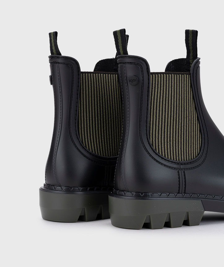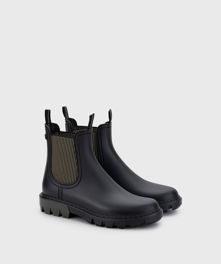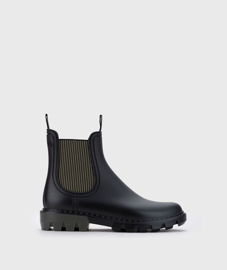Botín de agua de mujer bicolor tipo chelsea. Tiene elásticos de canalé combinados con el tacón y acabado mate, plantilla confort extraíble y forro textil.