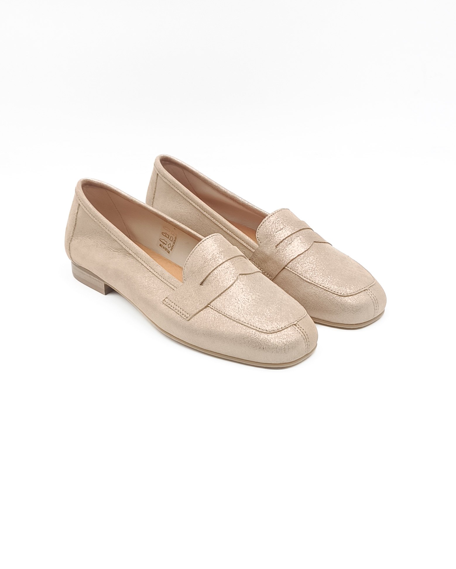 Este mocasín de mujer en serraje color dorado es un zapato cómodo y muy fácil de combinar. Al ir sin forro, se adaptan muy bien a distintas anchuras de pie y resultan más frescos incluso en días de calor.
