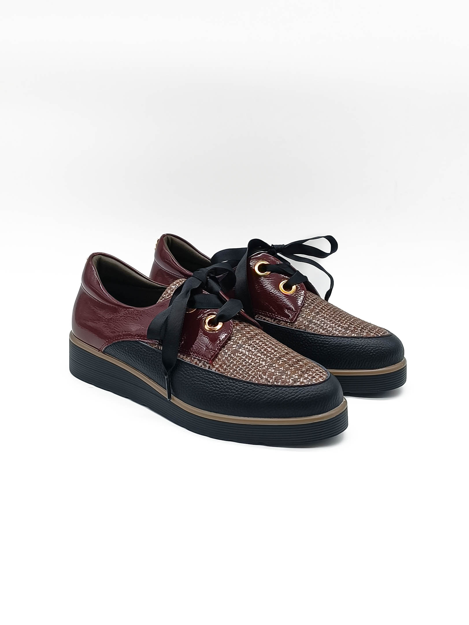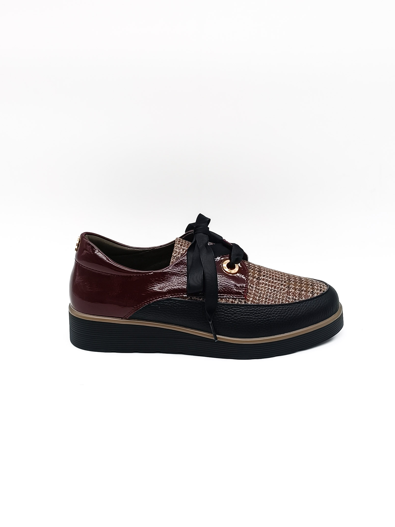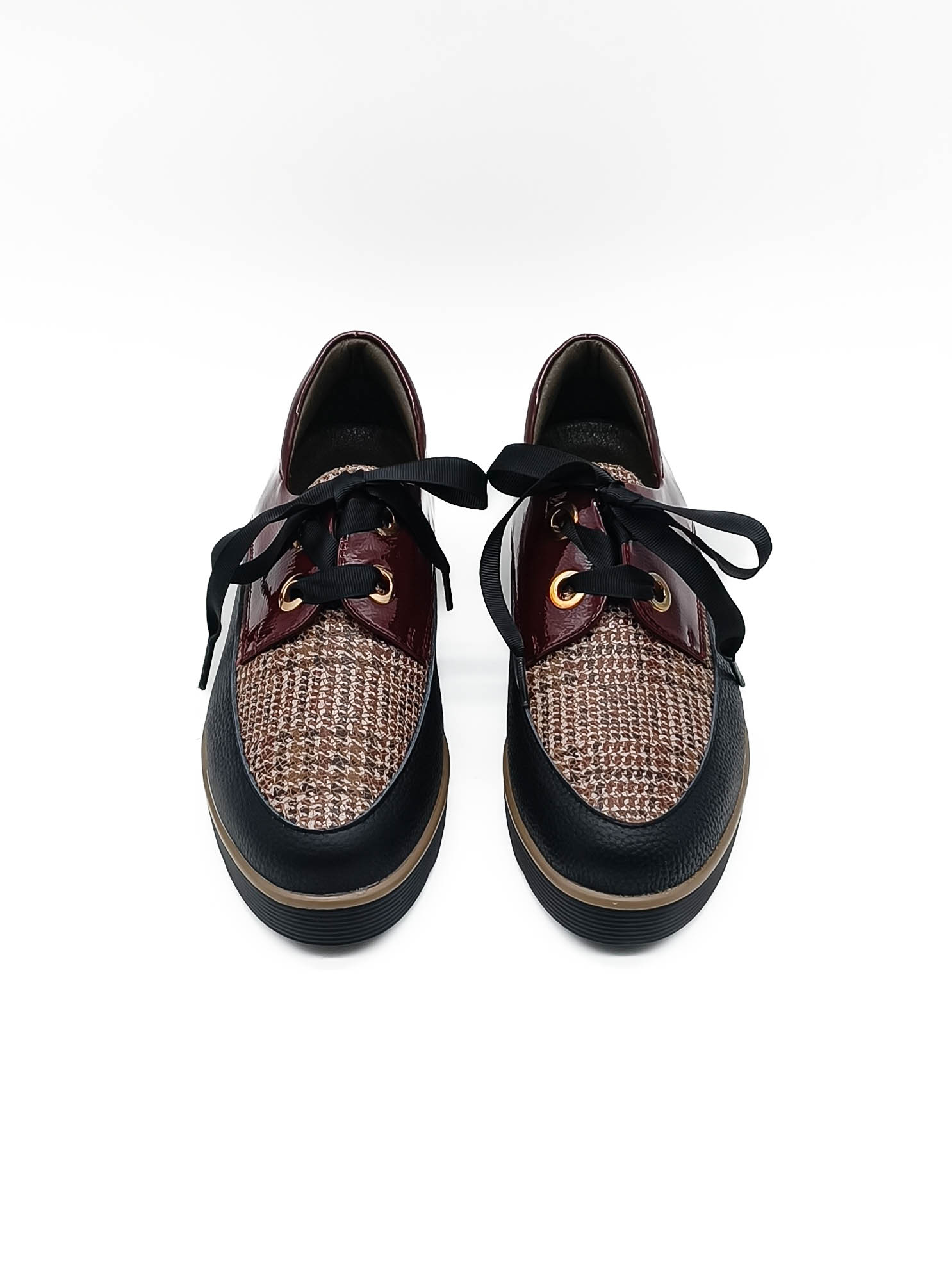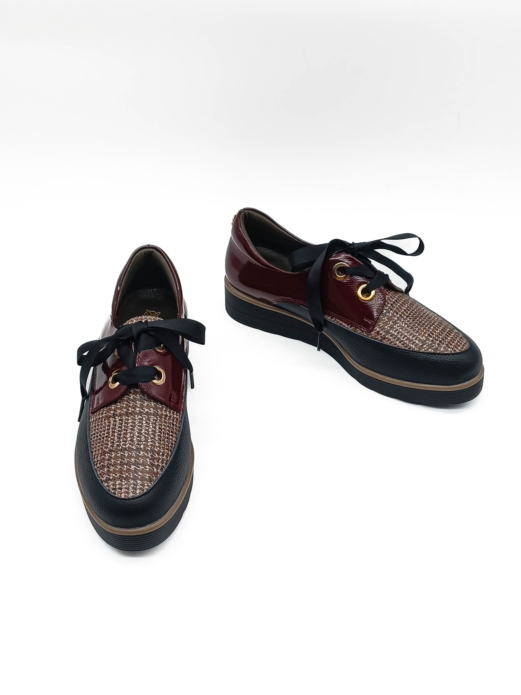 Preciosos zapatos tipo Oxford para mujer. Combinación espectacular de piel con dibujo de cuadros, piel charol y napa. Cordonera de lazo. Un estilo masculino con muchos toques de diseño y muy confortables.