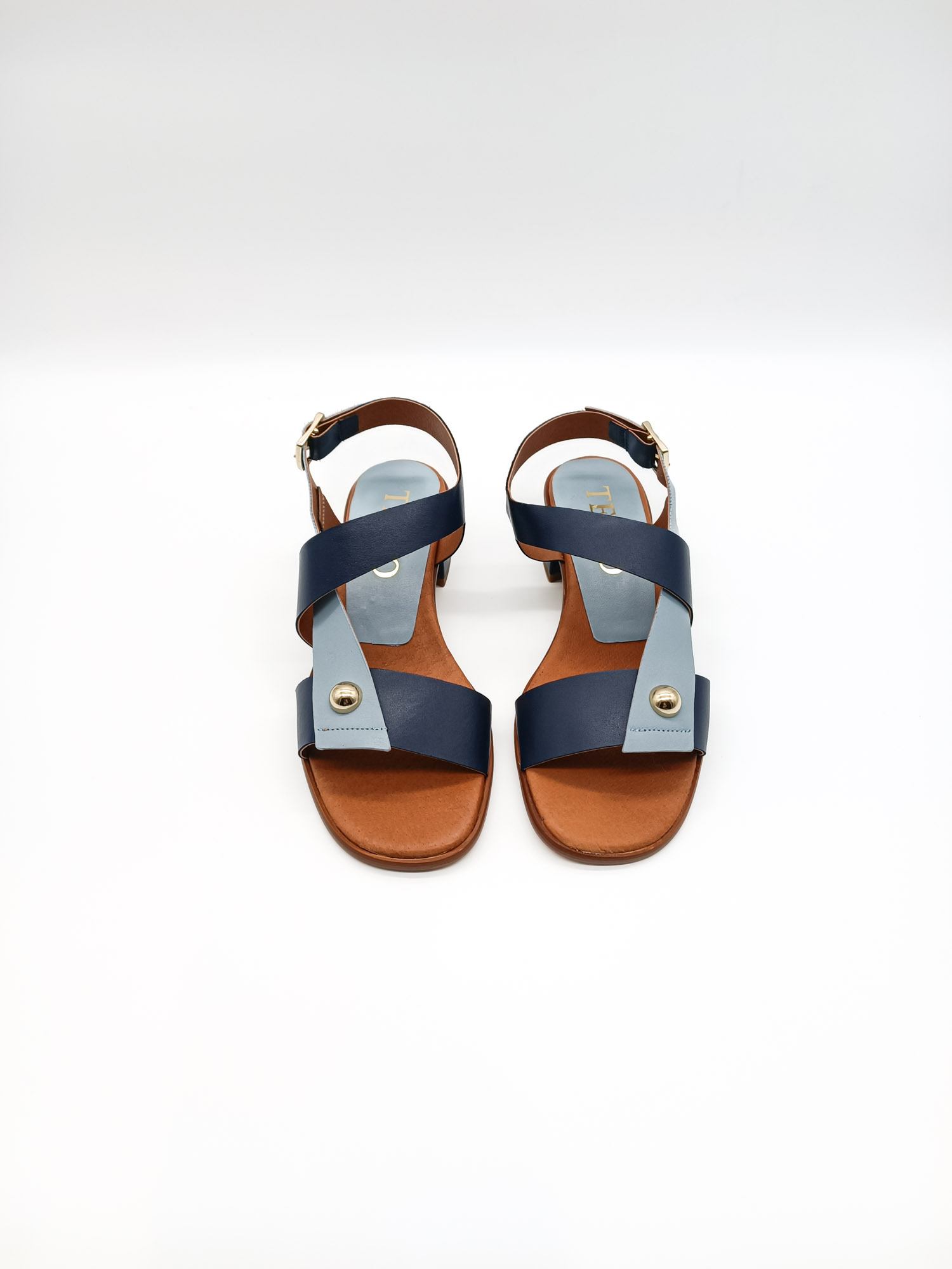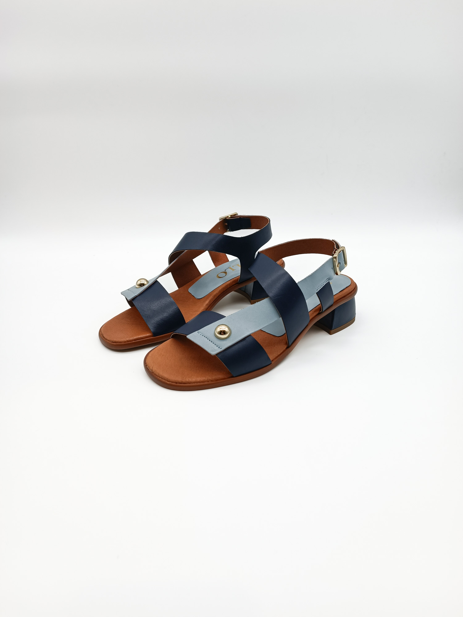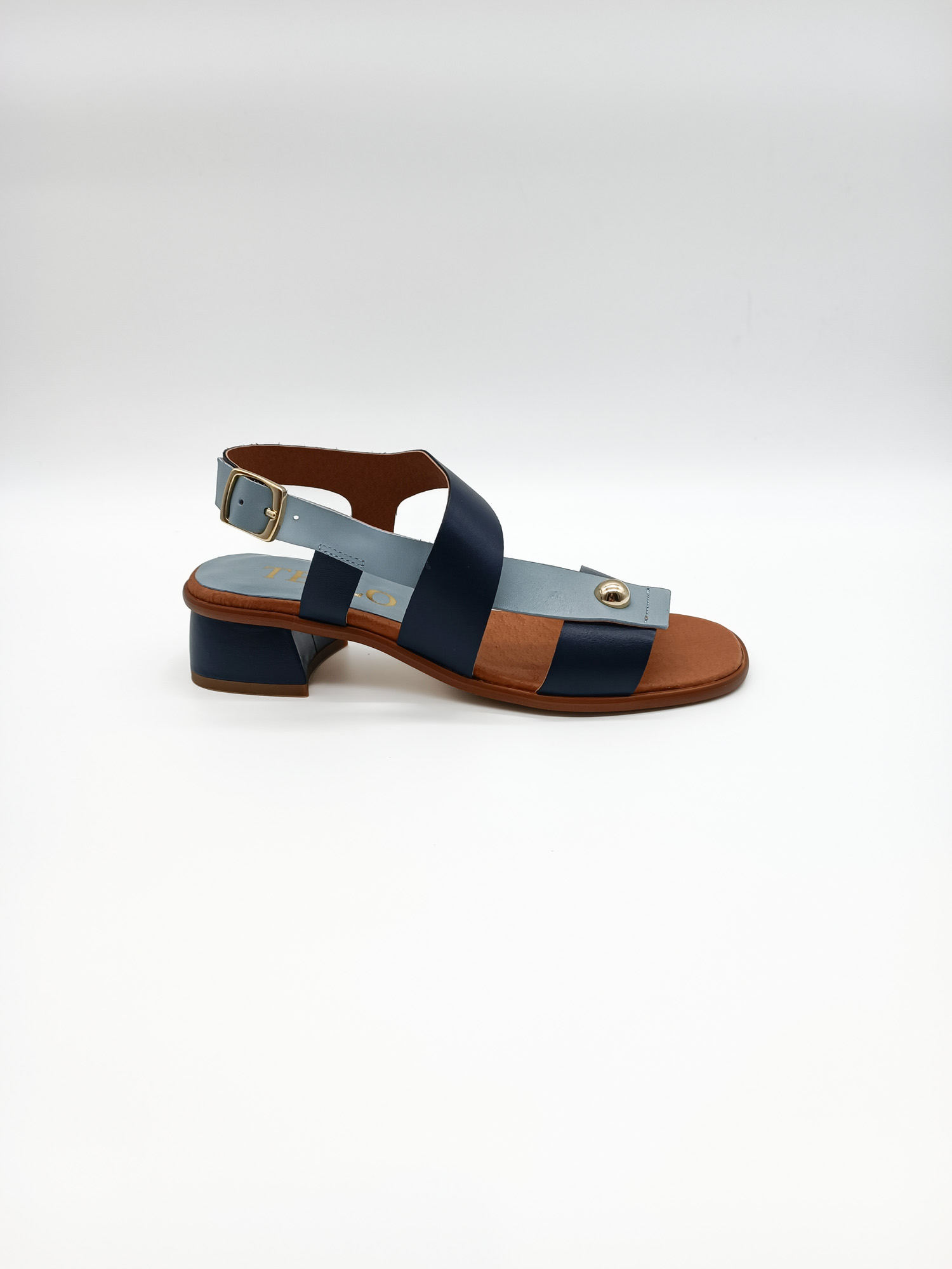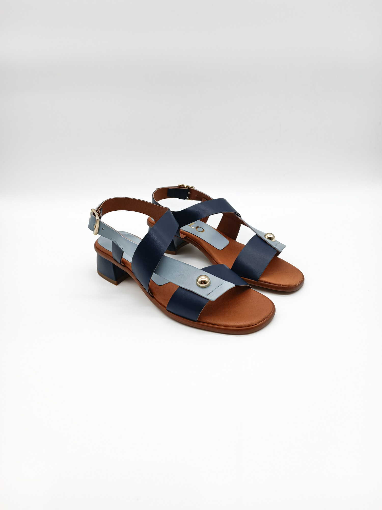 Sandalias de mujer en piel combinando marino y celeste.  El tacón de 3 cm forrado de piel le da un aire más elegante. Ideal para diario y eventos si eres fan de los tacones bajos y una «blue lover»